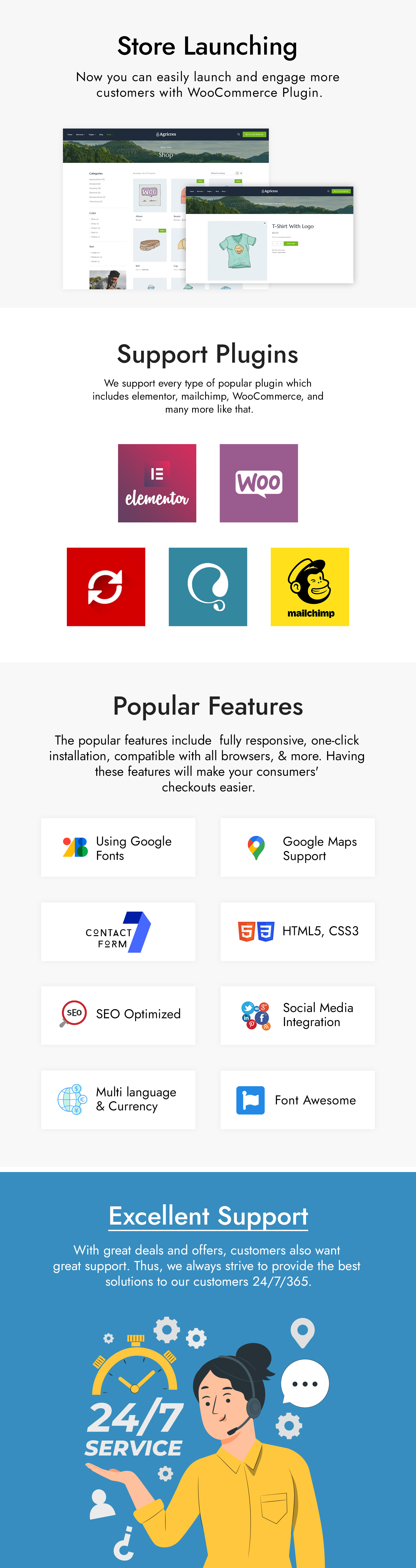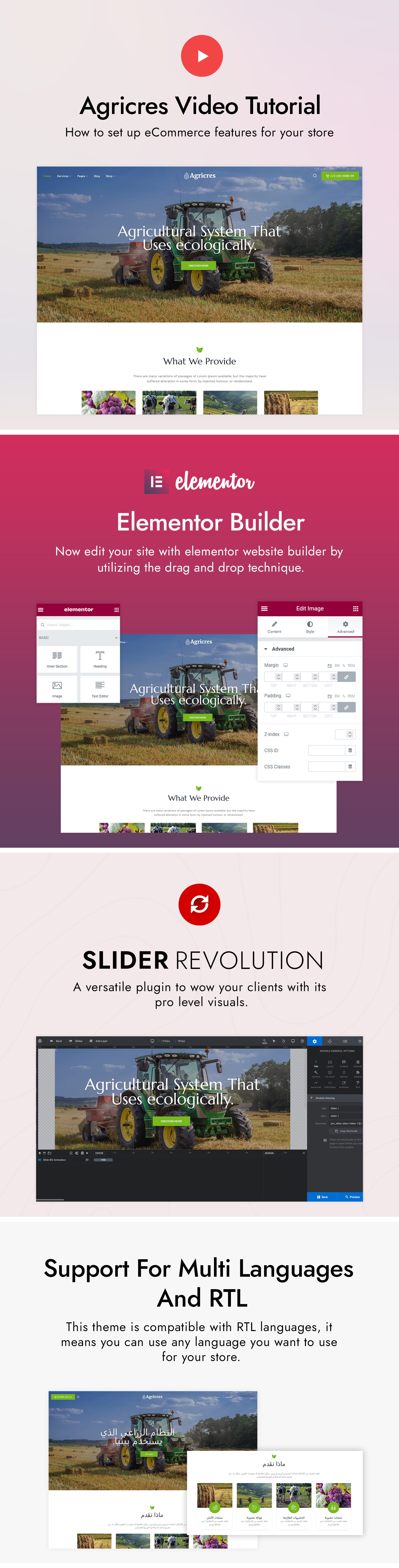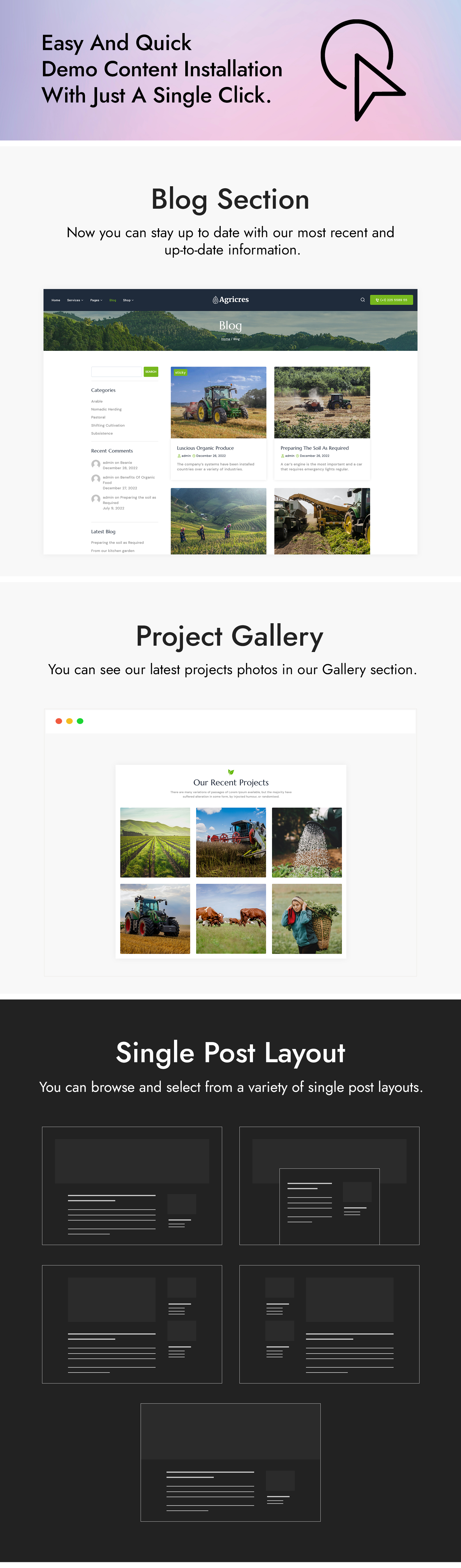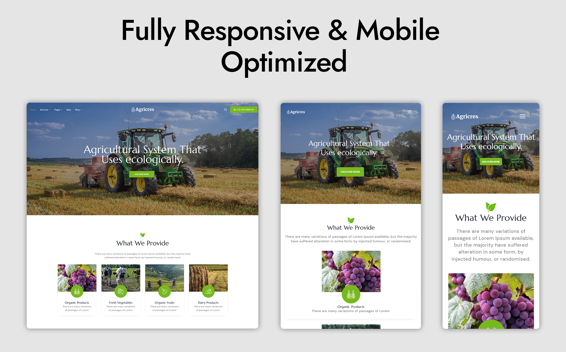 Agricres – revolutionary WordPress template caters to businesses involved in farming, eco-friendly product development, and organic food. Agricres contains the Elementor page builder, which enables you to edit every component with a drag-and-drop functionality. Using the Agricres WordPress theme, it is possible to import all data with a single click. Owing to its completely responsive mobile design, you can provide your consumers with a unique online experience across all platforms. Our well-written code will help you probably beat the competition and get to the top of the search engine results pages.