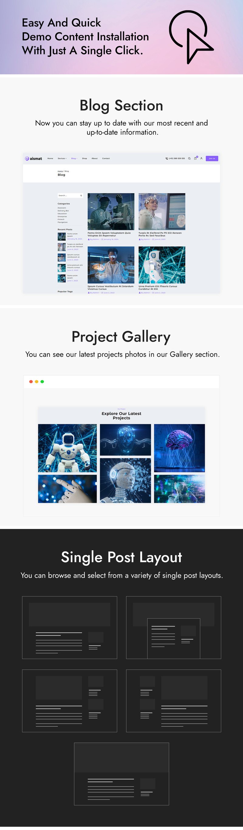 With our Aismat WordPress theme, you can transform your online presence by fusing modern AI with opulent style. A new era of innovation is ushered in by responsive interfaces and customizable layouts. Create an immersive experience with futuristic aesthetics and clever algorithms. Integrated features guarantee smooth navigation by streamlining user interactions. With AI Genesis, your website is endowed with the intelligence of the future, enabling users to explore the world of cutting-edge technology with each click.