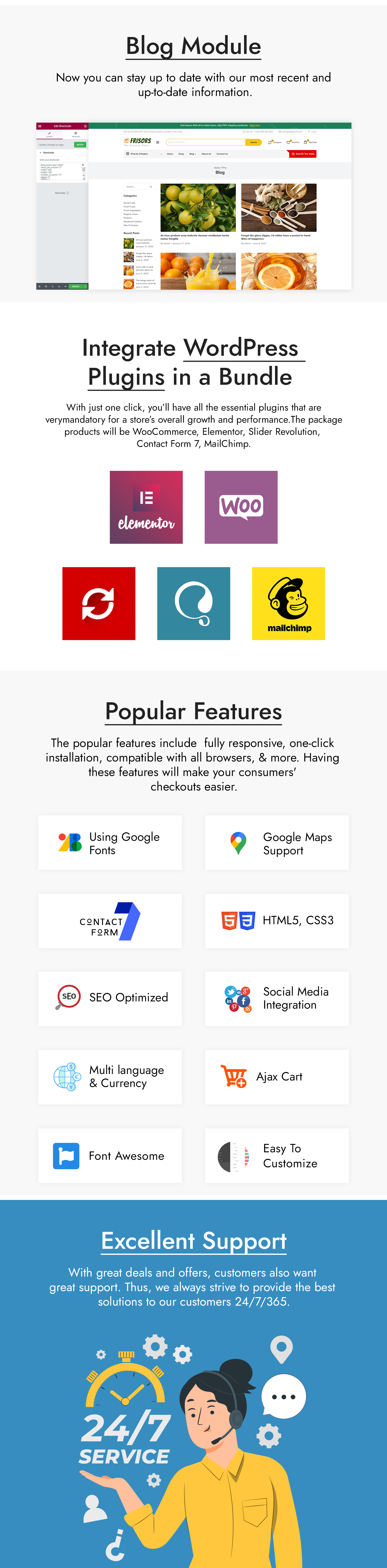 The Frisors – Supermarket & Natural Food Store WooCommerce theme is fantastic for building effective and dynamic websites. The fresh contemporary style of the Frisors theme provides a perfect fit for the food and veggie industries, and it combines smoothly with WooCommerce to provide an excellent buying environment. Because Elementor is used in its construction, creating different and striking layouts is a pleasure using the clicking and dropping editing. Display your products with thorough descriptions, excellent photos, and customer testimonials. Because the Frisors theme is entirely responsive, it will look great on any kind of device. It enhances the speed and visibility of your store with SEO optimization and quick loading times. Ideal for merchants trying to draw in health-conscious customers and increase sales.