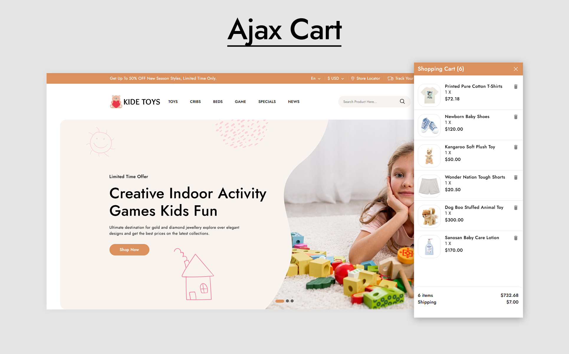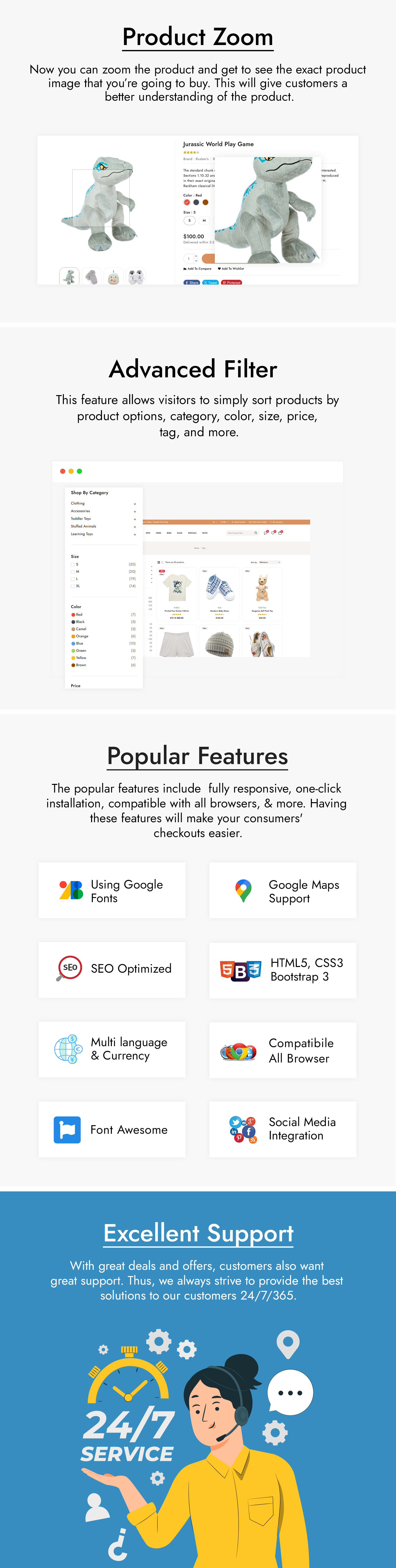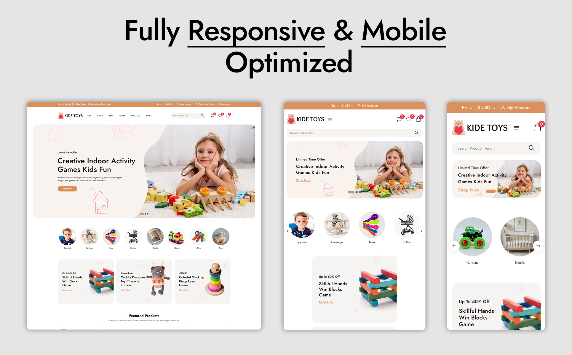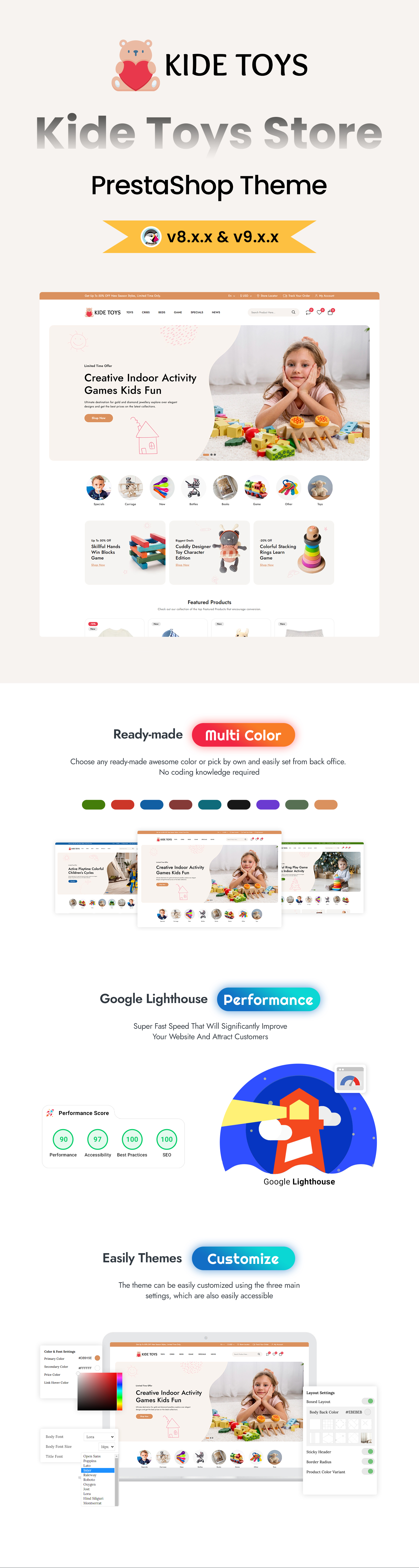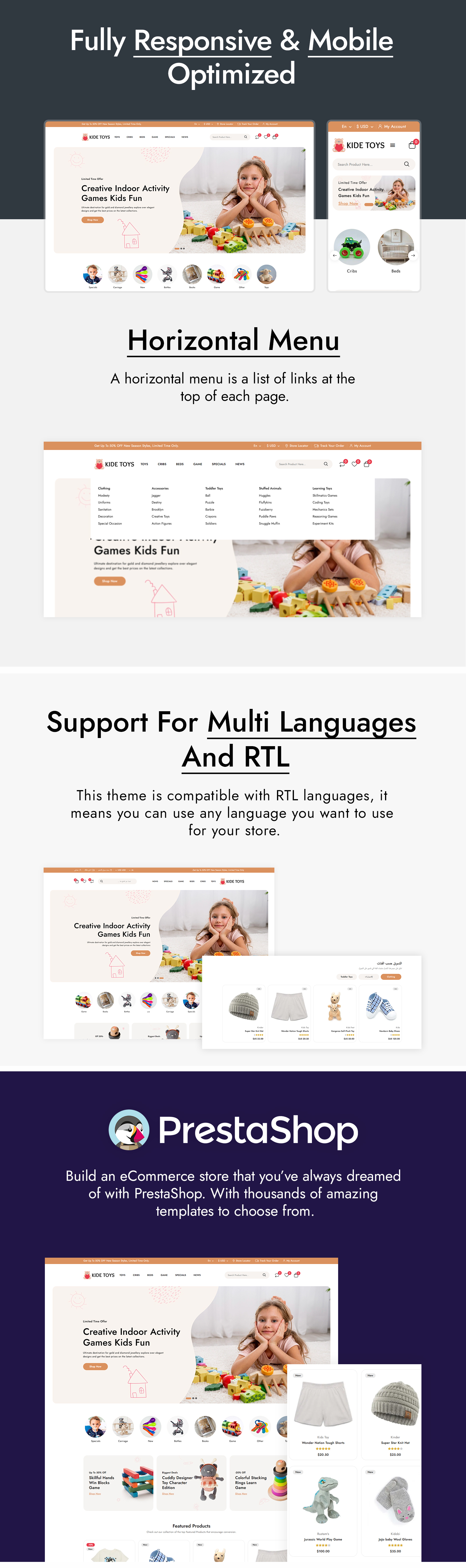 The lively and captivating Kide Toys-Kids Toys and Baby Store Prestashop Theme is an eCommerce solution made for toy stores, baby boutiques, and retailers of children’s products. Its lively layouts, entertaining style, and approachable font provide a happy shopping experience that appeals to both child and parent audiences right once. All devices may browse with ease thanks to the theme’s full responsiveness and performance optimization. To increase conversions, the Kide Toys theme incorporates sophisticated product filters, thorough product pages, advertising banners, and straightforward checkout procedures. It is perfect for expanding your online toy and baby store in a professional and successful manner because of its multilingual support, SEO-ready framework, and simple customization possibilities.