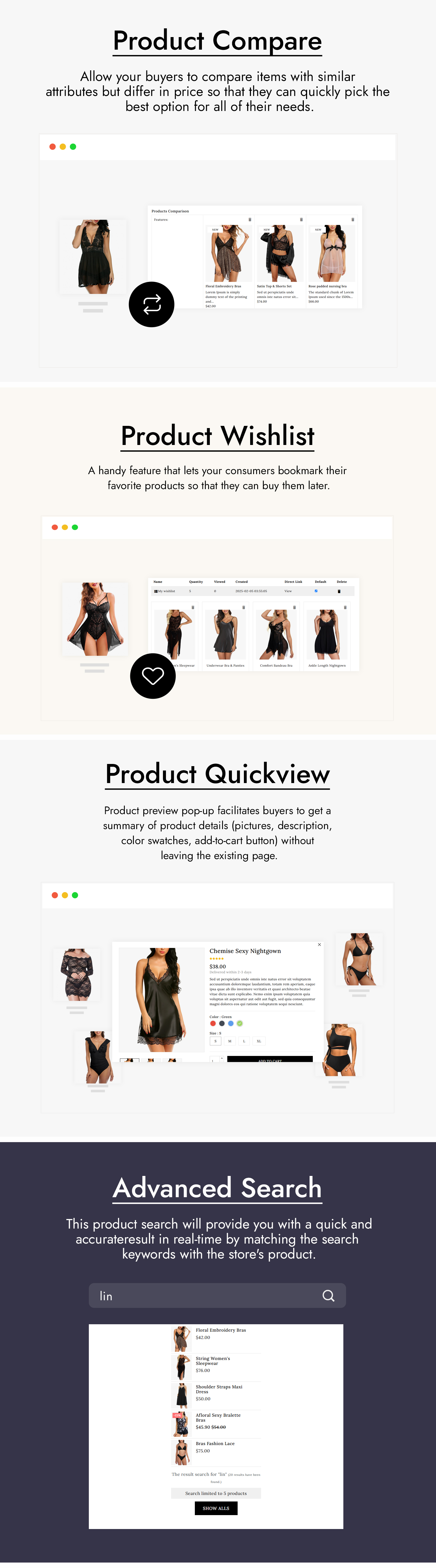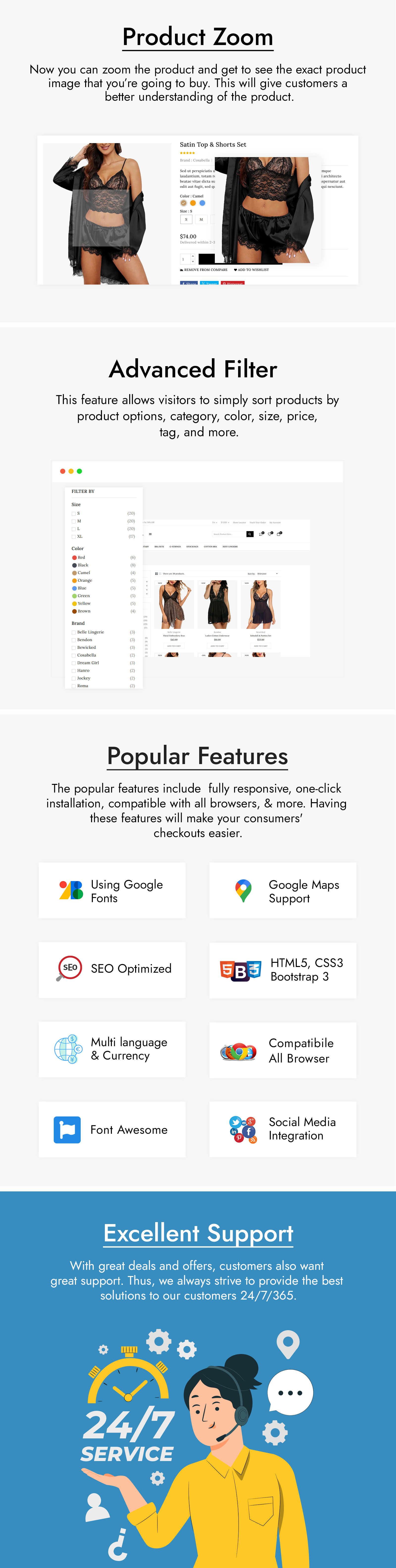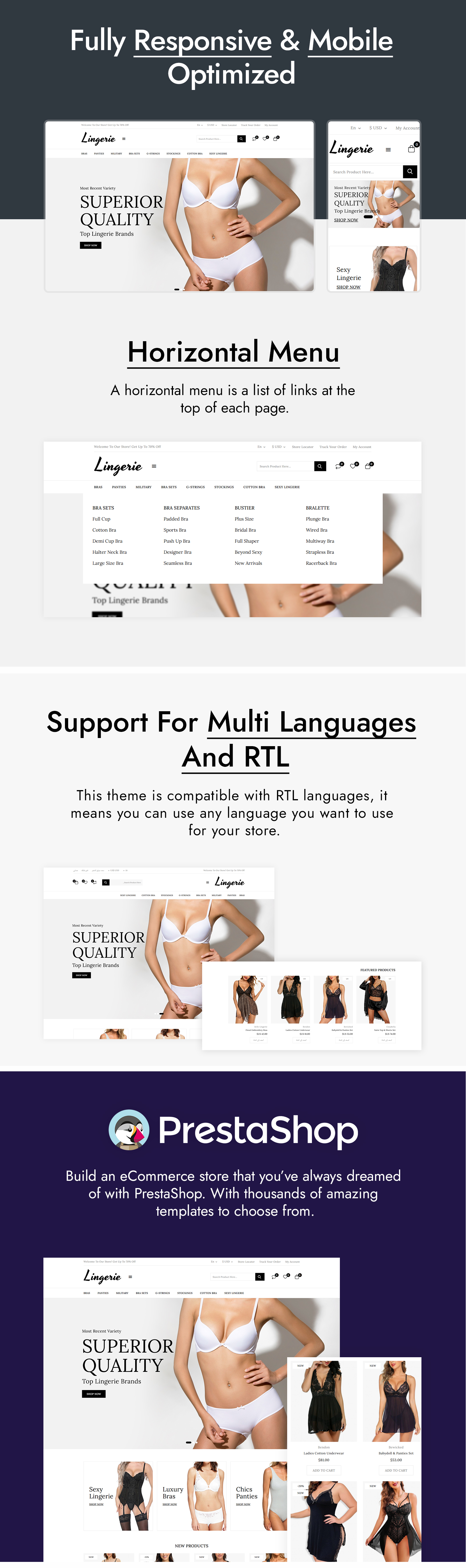 For online lingerie, personal wear, and fashion shops, the Lingerie & Fashion PrestaShop Responsive Theme is a chic and sophisticated option. This theme’s sleek, contemporary design elegantly displays lingerie lines, nightwear, and fashion accessories, all accompanied by excellent picture galleries and user-friendly navigation. It provides a seamless shopping experience with wishlist capabilities, secure payment, rapid product views, and sophisticated filtering, all seamlessly connected with PrestaShop. Customers may buy with ease because it is completely responsive and mobile-friendly, guaranteeing a faultless browsing experience on all devices.