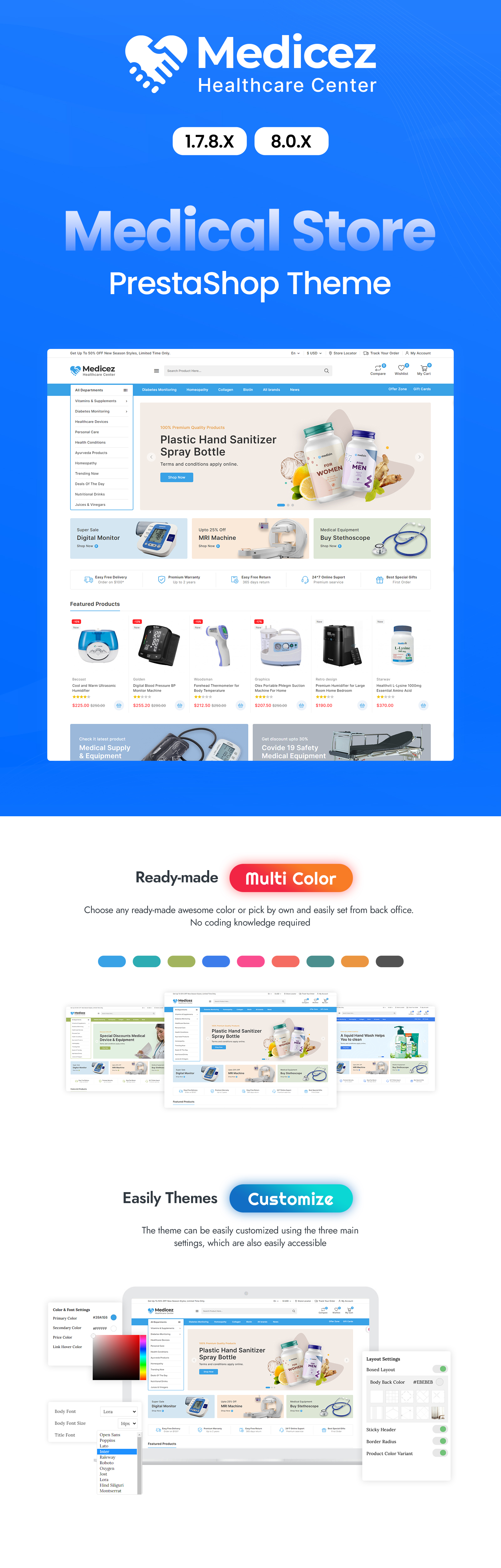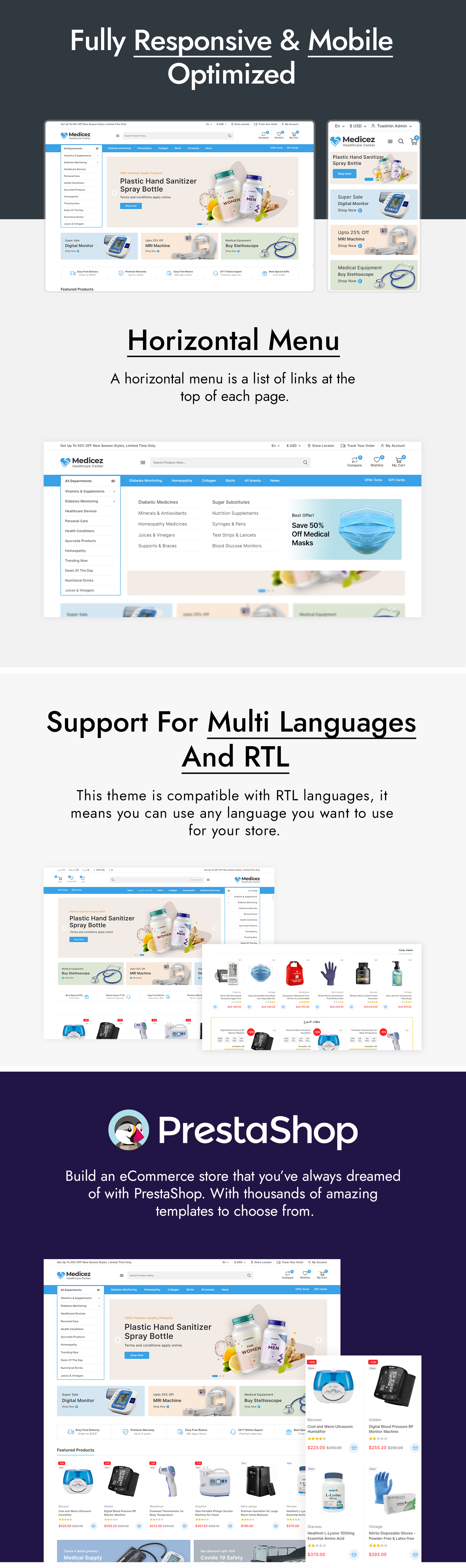 If you are looking simple PrestaShop theme that will be work for pharmacy, hospital, or medical-related? Medicez theme might be best choice available. With its contemporary features and appearance, the flexible Medicez theme may easily attract the user’s attention on your website. Additionally, the Medicez theme contains clean code, which will make it possible for your website to load more quickly. Users on your website will locate their preferred products quickly thanks to the simple navigation, sophisticated search, and numerous product categories and features. Also you will have a thorough guide that help you install theme very easily!