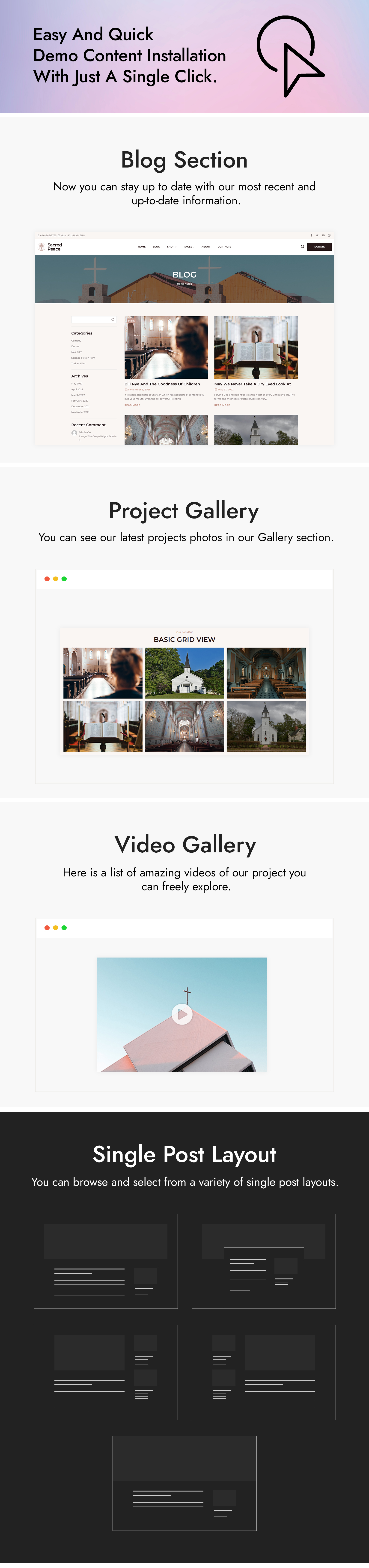 Check out the Sacred Peace innovative WordPress Theme was created to serve the demands of religious and charity activities of all shades, from churches and temples to online sanctuaries and foundations. Sacred Peace integrates a stunning aesthetic with comprehensive capabilities to exhibit sermons, blog posts, and community members. As an added bonus, the extensive customization possibilities provided by the theme’s design ensure a perfect match with your particular requirements. Although Sacred Peace is beneficial for everyone, non-techies will especially appreciate its simplicity. Other advantages include the theme’s adaptability, ease of use, and compatibility with any modern device setup.