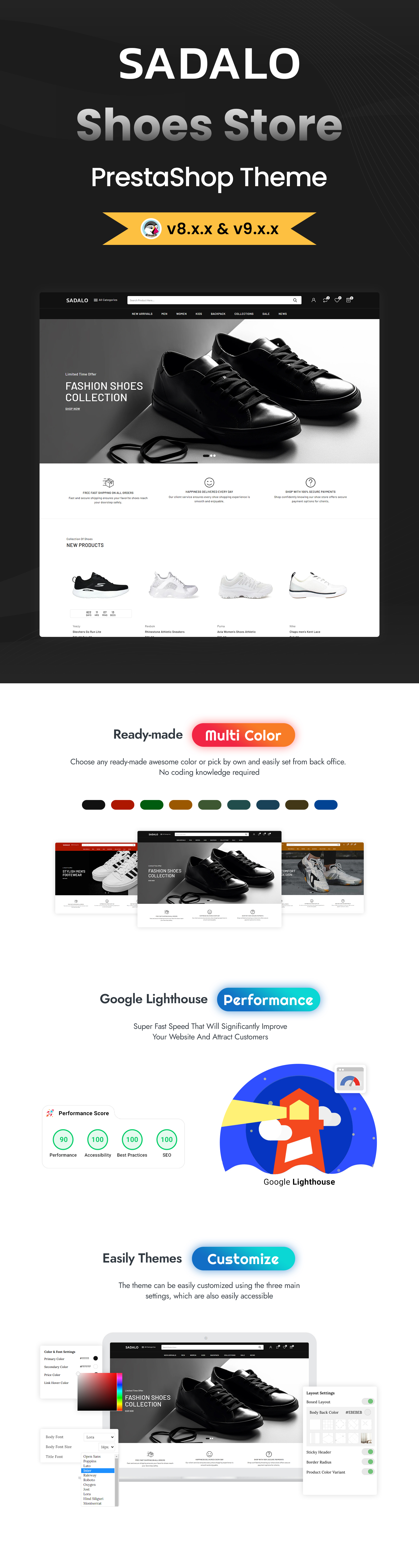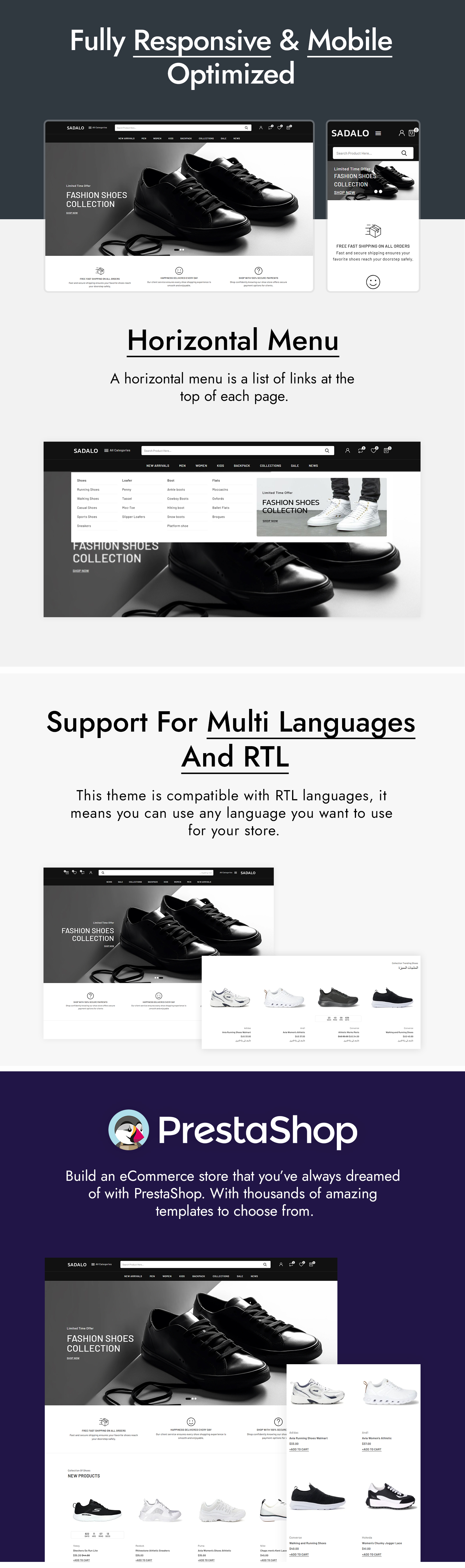 Sadalo: Fashion Store for Shoes A chic and contemporary eCommerce solution created especially for fashion and footwear firms is PrestaShop Theme. The Sadalo theme offers a captivating shopping experience on all platforms thanks to its simple, sophisticated design and intuitive interface. The theme’s adaptable design, wishlist, quick view, and sophisticated product filtering guarantee simple navigation and speedier transactions. Its high degree of customization makes it simple to change layouts, colors, and typefaces to reflect your brand. Sadalo theme is performance-driven and SEO-optimized, increasing visibility without sacrificing seamless operation. It blends superior design with powerful functionality to create a high-end online store experience, making it ideal for shoes, sneakers, or fashion accessories.