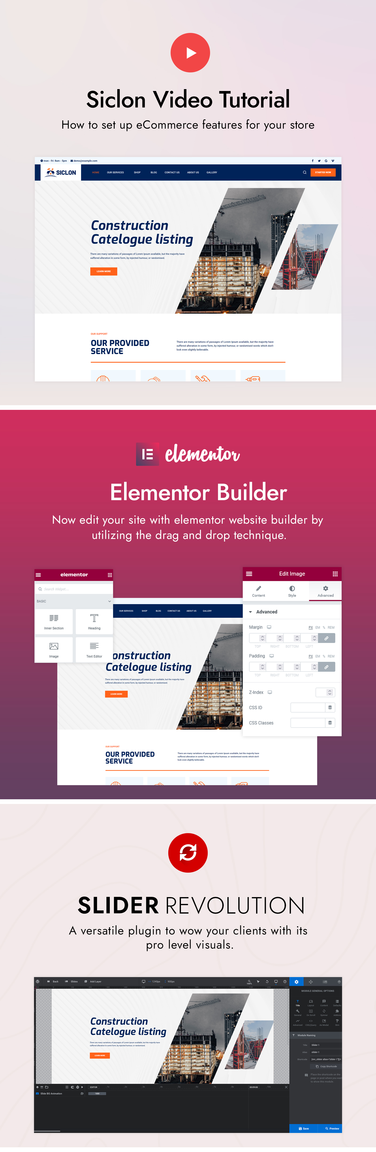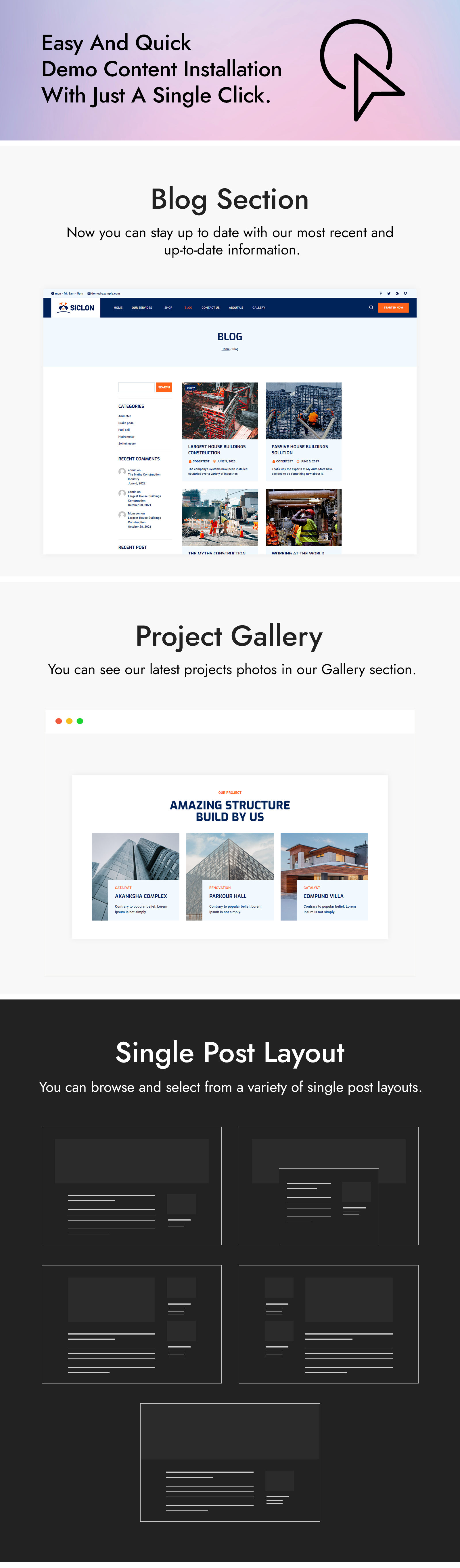 A construction, real-estate and architecture website needs to be reliable. Siclon theme is best choice for website because it meets every requirement for construction and real-estate businesses sites. A websites main page slider grabs users’ attention, special effects give it a more contemporary appearance, and counters boost users’ confidence. You may effectively present your work to clients by using one of the many different sorts of galleries. The blog option will be highly beneficial for describing your ongoing projects, disseminating the most recent news from the building and real estate sectors, and boosting the SEO of your website.