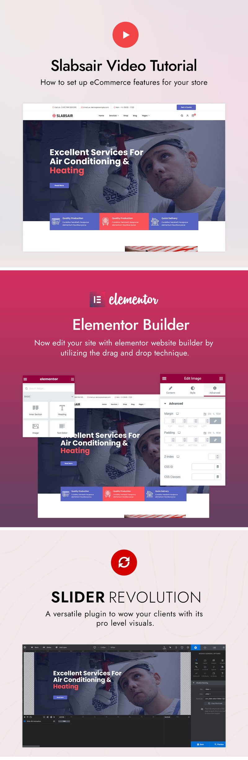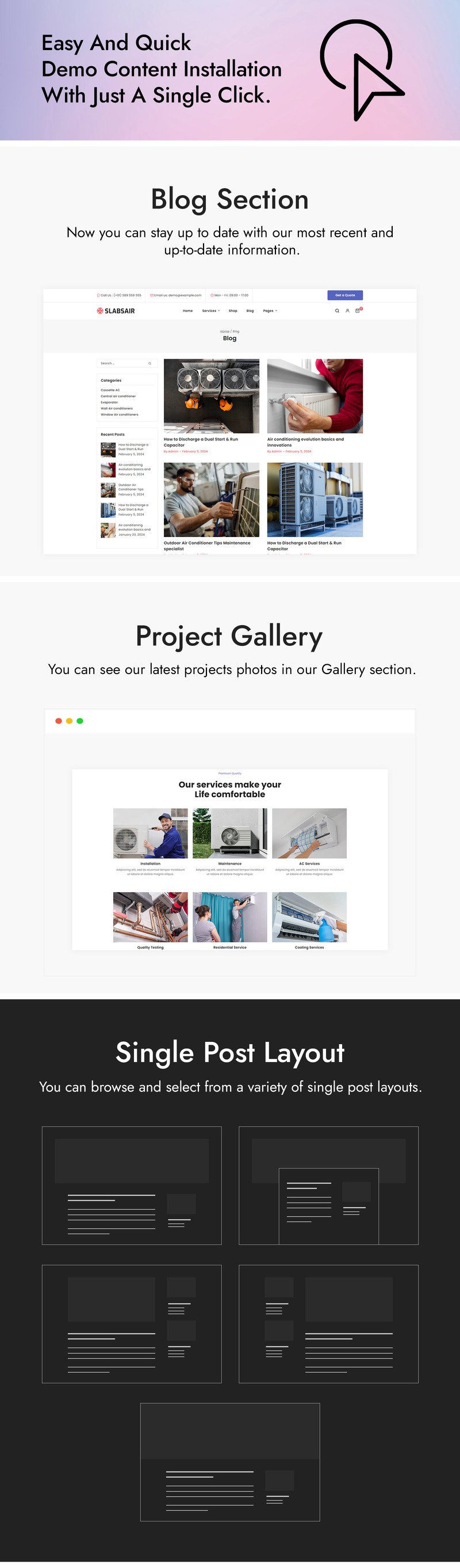 Transform Air Conditioning & Heating websites with our Slabsair WordPress theme, seamlessly blending functionality with aesthetics. Customizable layouts and responsive design ensure an immersive user experience. From cooling solutions to heating systems, navigate effortlessly through our integrated features for comfort and reliability. With Slabsair, redefine the digital landscape of Air Conditioning & Heating services, providing warmth and cool comfort with every click. Our Air Conditioning and Heating WordPress Theme gives you the resources you need to improve your online visibility and expand your company in the cutthroat HVAC sector, regardless of whether you specialize in residential or commercial HVAC services. Improve your website right now to differentiate it from the competition.
