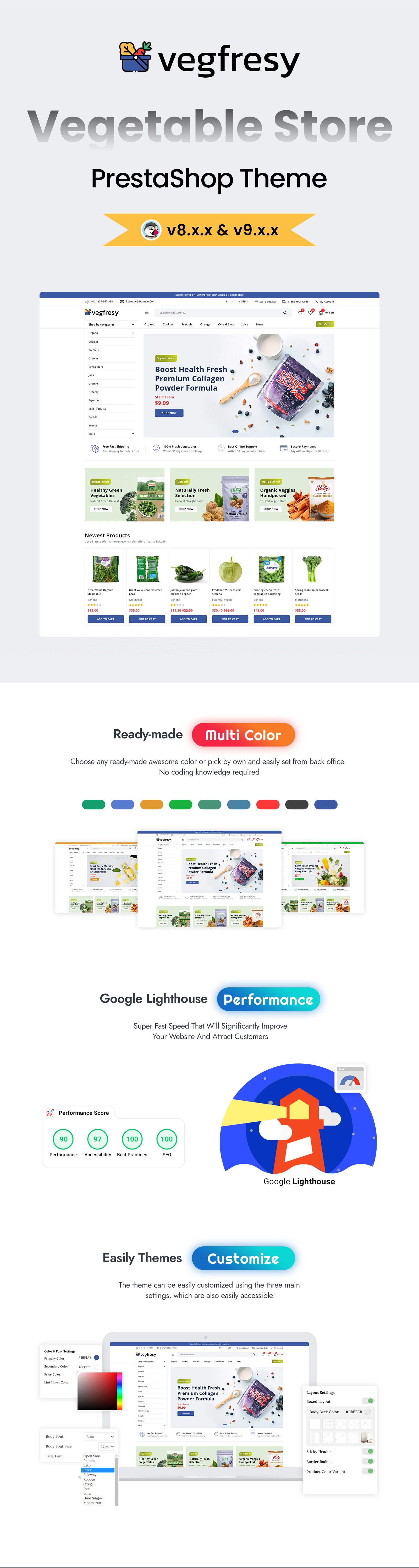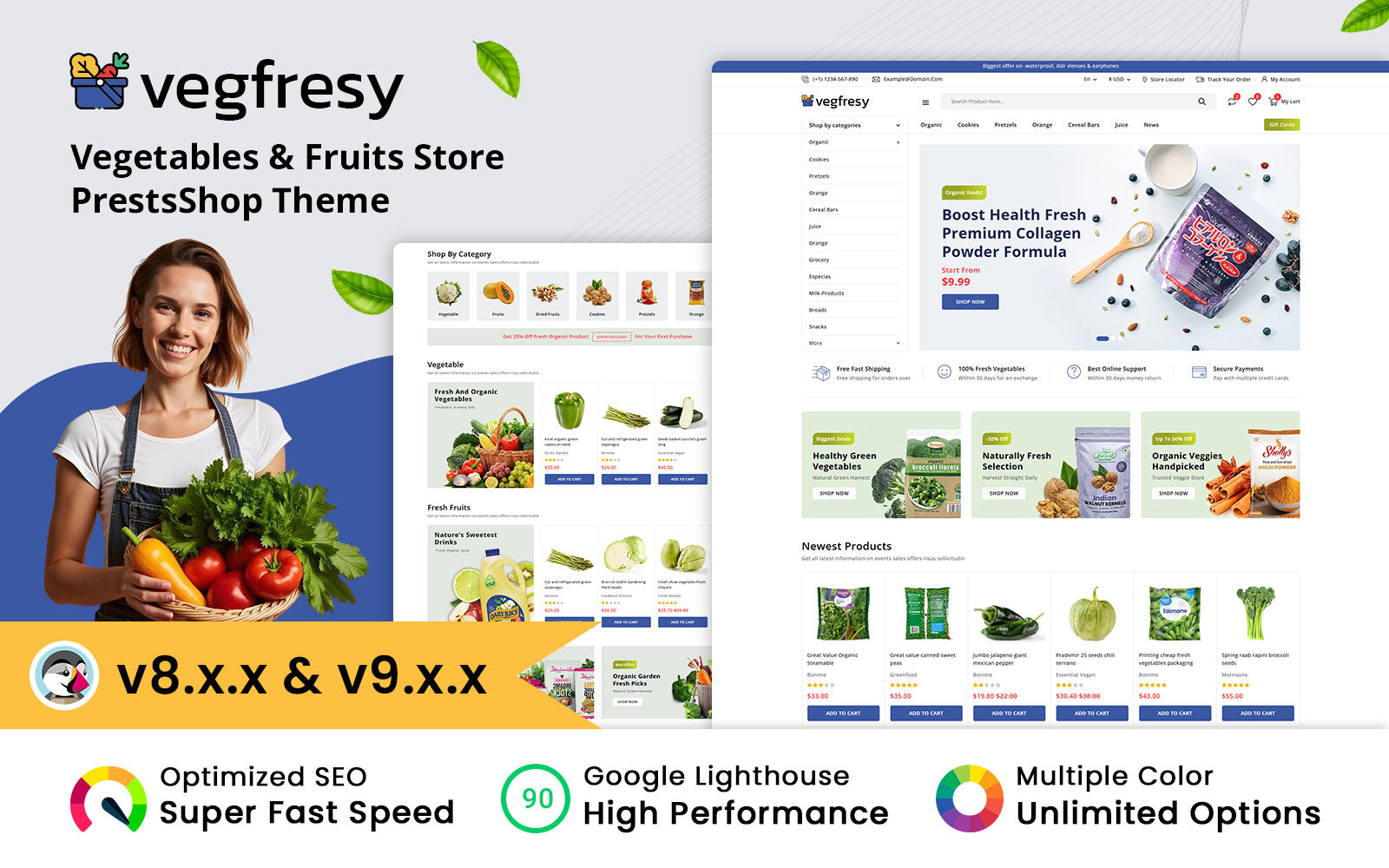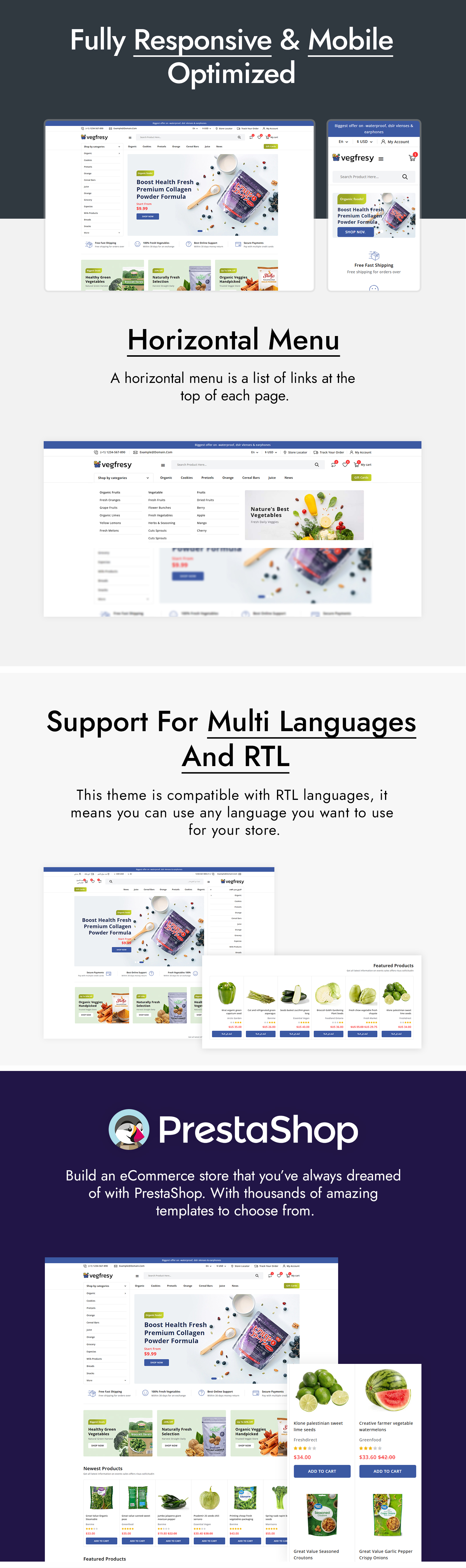 Vegfresy: Organic Food and Vegetables Store PrestaShop Theme is a trendy, clean, and fresh online store solution developed by organizations who sell organic produce, food, and wellness items. The theme, which draws inspiration from nature, has vivid layouts, organic color schemes, and user-friendly product sections that exquisitely display farm-fresh fruit. The Vegfresy theme is completely responsive and mobile-friendly, guaranteeing seamless browsing across all platforms. It offers quick view, promotional advertising, sophisticated product filtering, and simple checkout for a flawless buying experience. The Vegfresy theme, which is optimized for SEO and performance, aids in raising awareness, fostering consumer confidence, and establishing a polished online store that prioritizes quality and freshness.