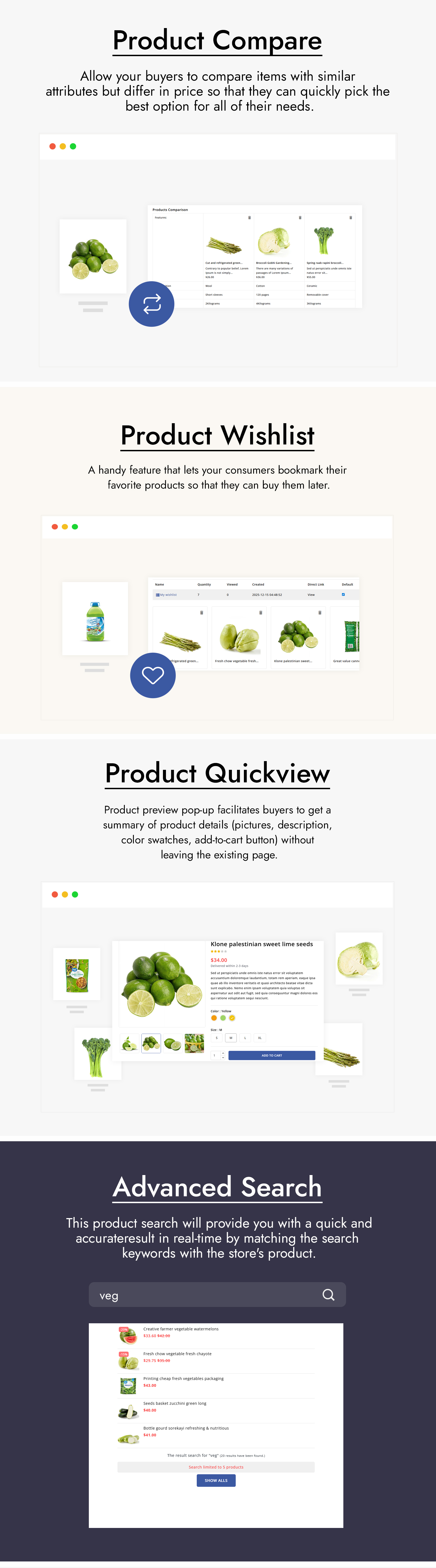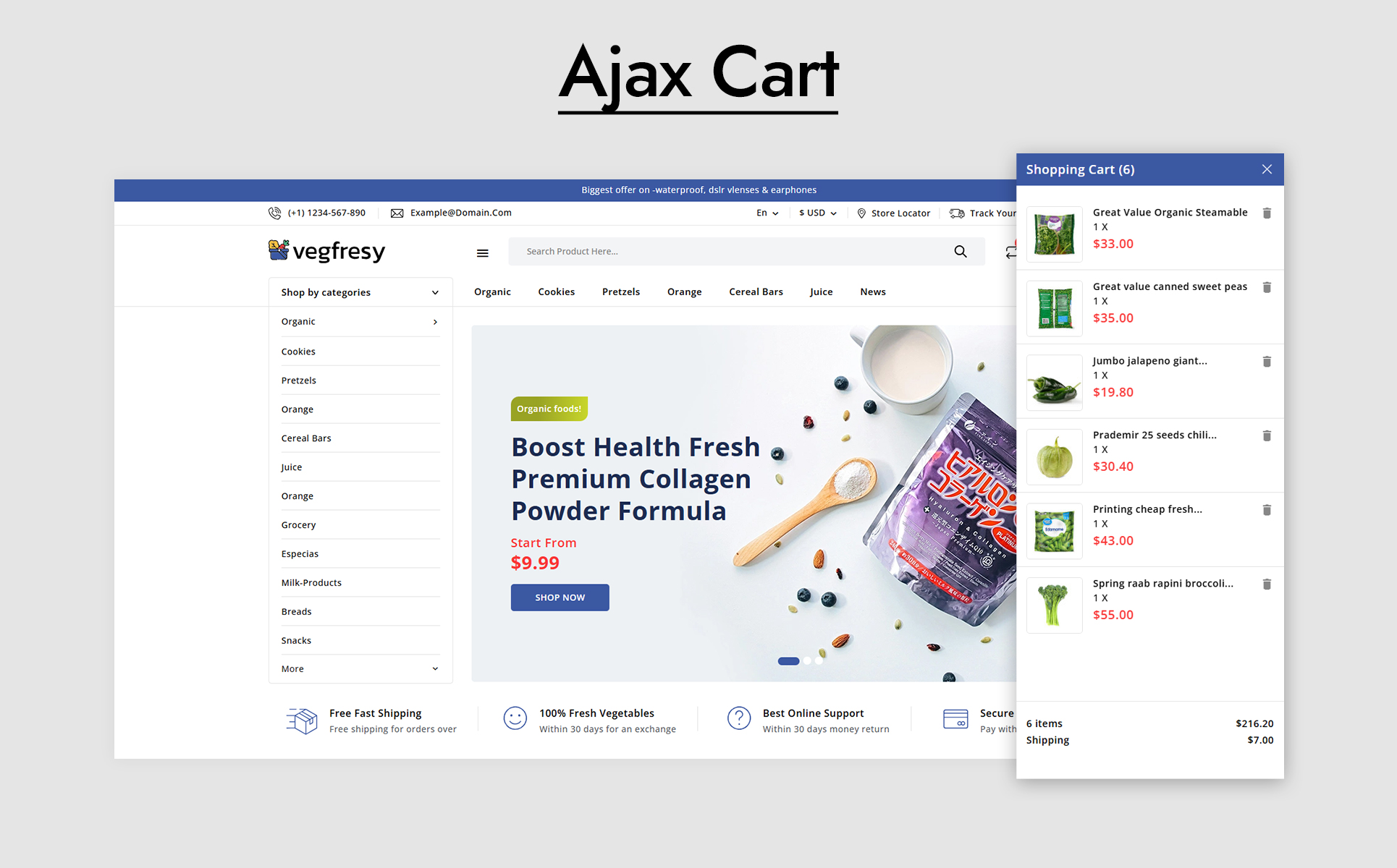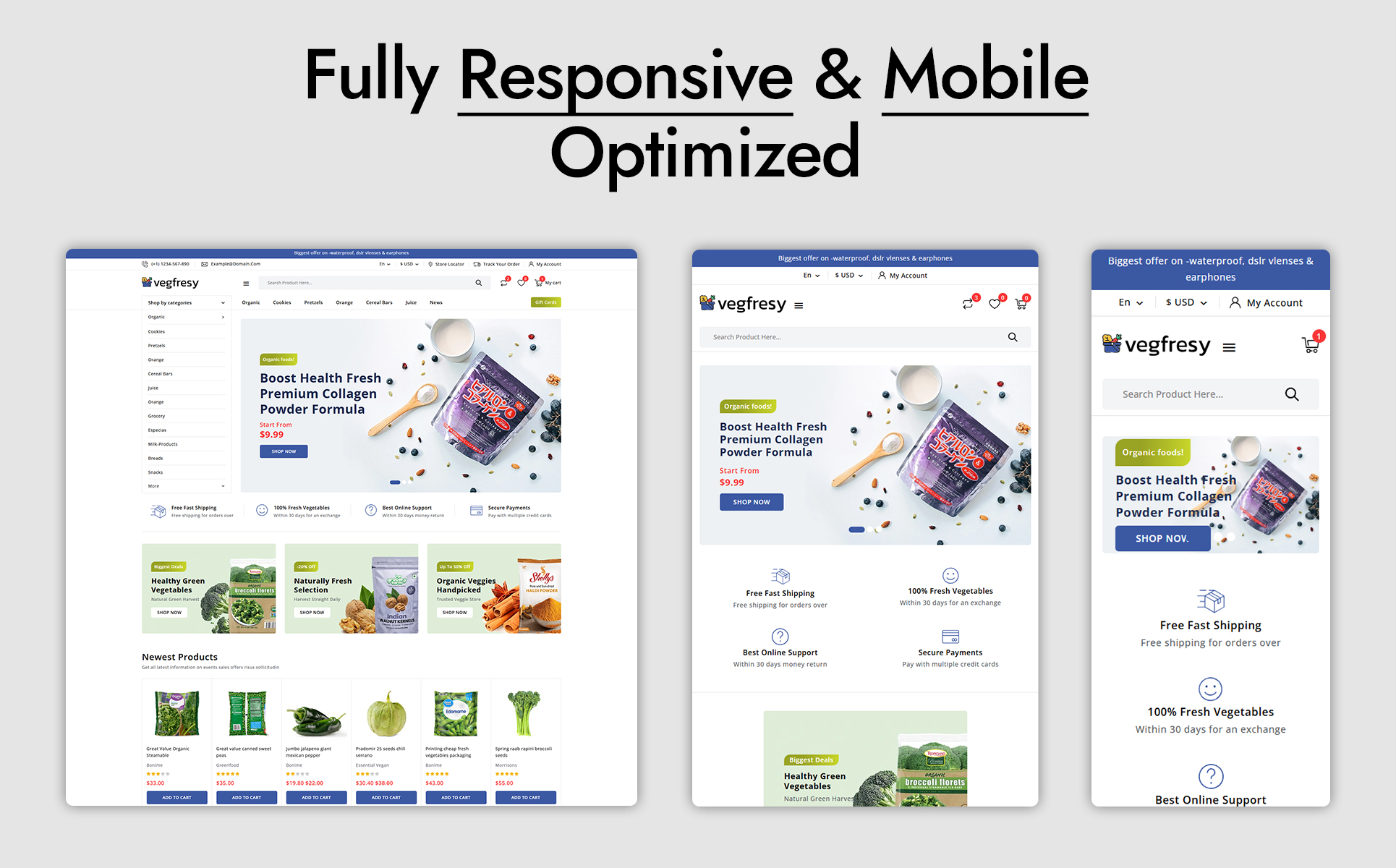 Vegfresy: Organic Food and Vegetables Store PrestaShop Theme is a trendy, clean, and fresh online store solution developed by organizations who sell organic produce, food, and wellness items. The theme, which draws inspiration from nature, has vivid layouts, organic color schemes, and user-friendly product sections that exquisitely display farm-fresh fruit. The Vegfresy theme is completely responsive and mobile-friendly, guaranteeing seamless browsing across all platforms. It offers quick view, promotional advertising, sophisticated product filtering, and simple checkout for a flawless buying experience. The Vegfresy theme, which is optimized for SEO and performance, aids in raising awareness, fostering consumer confidence, and establishing a polished online store that prioritizes quality and freshness.